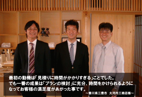 大河内社長:「何を目処にIT投資を考えるか」ですが「積算担当1人分」や「現在、積算にかかっている人件費コスト」「設計事務所に依頼している図面作成費」などを考えて、「月数万円でこれだけの内容の事をやってもらえる人がいるのか」を考慮しました。しかしあまりにも費用が高額だと情報投資として腰が重たくなるという事はあると思います。